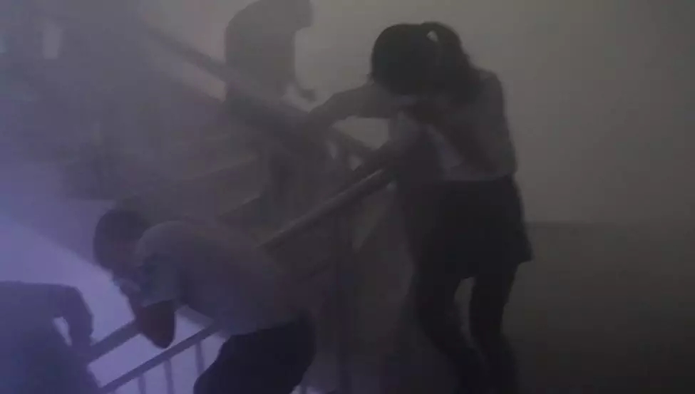 演練現(xiàn)場(chǎng)模擬鐵塔工業(yè)園一棟樓房發(fā)生火情,樓道煙霧彈模擬散發(fā)出大量濃煙,著火企業(yè)立即按程序進(jìn)入應(yīng)急狀態(tài),對(duì)內(nèi)疏散、自救。發(fā)現(xiàn)火勢(shì)較大,拔打119報(bào)警求助。