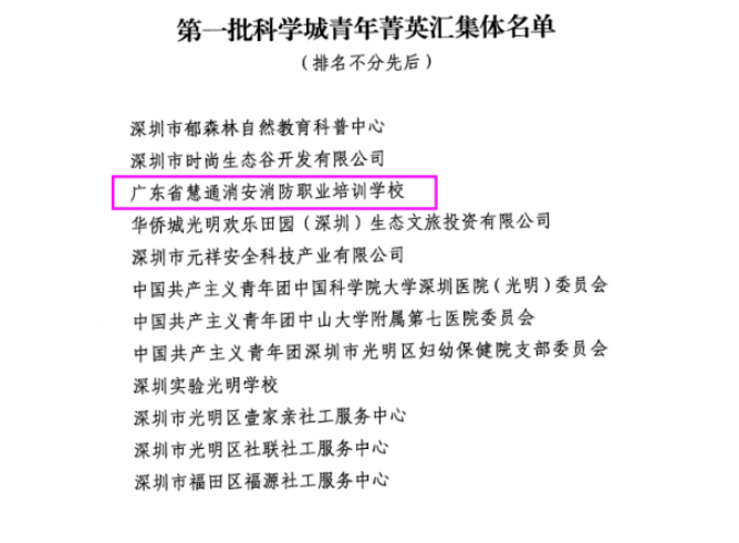 2022年3月,經(jīng)共青團(tuán)深圳市光明區(qū)委員會審核研究,廣東省慧通消安消防職業(yè)培訓(xùn)學(xué)校獲評第一批科學(xué)城青年菁英匯集體之一。