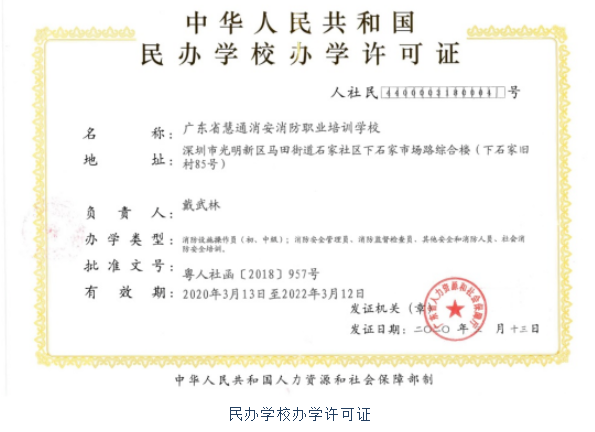 廣東省慧通消安消防職業(yè)培訓(xùn)學(xué)校于2018年由深圳慧通消安產(chǎn)業(yè)科技有限公司捐贈創(chuàng)辦,位于廣東省深圳市光明區(qū)馬田街道消防安全文化小鎮(zhèn),使用面積2000平米,是光明區(qū)唯一經(jīng)廣東省消防總隊驗收審核、省人力資源和社會保障廳批準(zhǔn)、省民政廳核準(zhǔn)登記的消防職業(yè)培訓(xùn)機構(gòu),深圳市應(yīng)急管理局核準(zhǔn)的安全培訓(xùn)機構(gòu)。