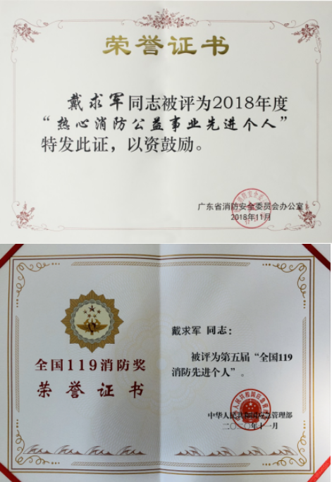 學(xué)校創(chuàng)始人、基地創(chuàng)始人戴求軍先生于2018年11月被廣東省消防安全委員會評為廣東省2018年度“熱心消防公益事業(yè)先進(jìn)個人”;2020年11月被中華人民共和國應(yīng)急管理部評為全國119消防先進(jìn)個人。