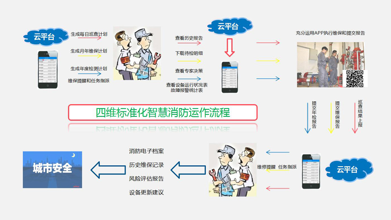 "四維標(biāo)準(zhǔn)化智慧消防"是由董事長戴求軍先生首次提出,旨在通過一個(gè)消防物聯(lián)網(wǎng)系統(tǒng)將消防管理的監(jiān)管單位、主體單位、 維保單位以及運(yùn)維單位聯(lián)合起來,通過云平臺提供的標(biāo)準(zhǔn)化服務(wù),全面提高消防管理效率和提升社會的安全系數(shù)。 系統(tǒng)由一個(gè)部署在華為云上的平臺系統(tǒng)和一個(gè)用于巡檢維保的手機(jī)APP組成。